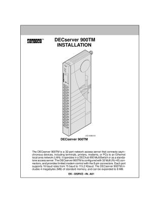 It describes the DECserver 900TM as a 32-port network access server designed to connect asynchronous devices (like terminals, printers, modems, or PCs) to an Ethernet LAN. It can operate either within a DEChub 900 MultiSwitch or as a standalone server, featuring 32 RJ-45 connectors, support for various baud rates (75 to 115.2 Kbaud), and 4MB (expandable to 8MB) of memory.