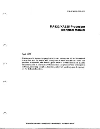 This document is the KA820/KA825 Processor Technical Manual (EK-KA820-TM-003), published by Digital Equipment Corporation in April 1987. It serves as a comprehensive guide for the KA820 and KA825 single-board VAX processor modules, primarily used in VAX 8250 and 8350 computer systems. The KA825 is an enhanced version of the KA820, offering higher performance.
