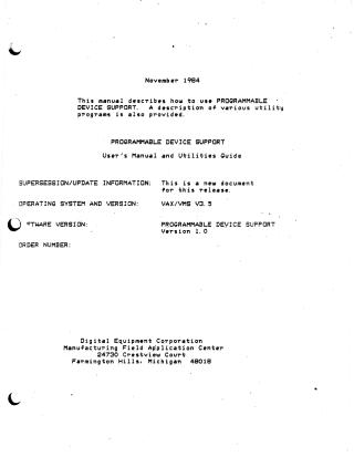 This manual serves as a user's guide and utilities guide for Programmable Device Support (PDS), a system designed to manage and maintain programmable devices on a shop floor. Published in November 1984, it targets individuals in database administration, operations, and programmers familiar with the VAX/VMS operating system and high-level programming.