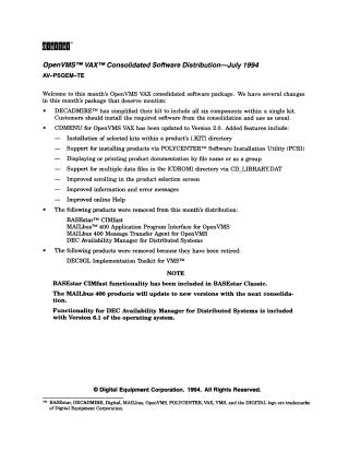 This document announces changes within the July 1994 OpenVMS VAX consolidated software package. Key updates include a simplified DECADMIRE™ kit, which now combines all six components into a single installation. The CDMENU for OpenVMS VAX has been updated to Version 2.0, introducing features such as kit installation within product directories, POLYCENTER™ Software Installation Utility (PCSI) support, improved documentation access, multiple data file support, enhanced scrolling, better error messages, and improved online Help.
