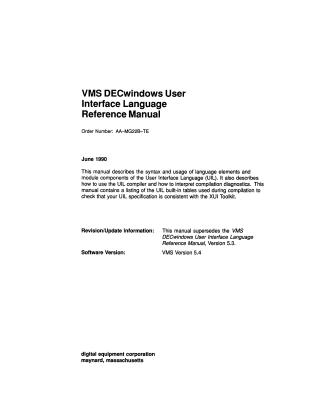 This manual serves as a reference for the User Interface Language (UIL), a specification language for defining the initial state of user interfaces for VMS DECwindows applications. It details the syntax and usage of UIL language elements and module components, explains how to use the UIL compiler, and guides on interpreting compilation diagnostics. The document also includes UIL built-in tables to ensure consistency with the XUI Toolkit.
