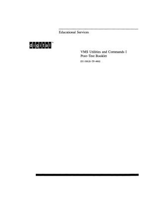 This document is a post-test booklet for the "VMS Utilities and Commands I" educational course. It contains two sections: Questions (1.1) and Answers (1.2). The questions are multiple-choice and cover various VMS DCL commands and concepts, such as logging in, displaying files, moving files, creating subdirectories, managing batch and print queues, using symbols and logical names, defining global values, testing character strings, working with labels, changing passwords, terminating processes, and matching DCL commands and system components to their functions. The answer section provides the correct answers to the questions.