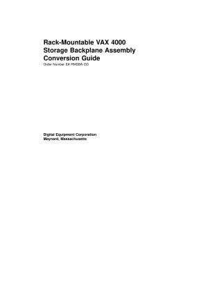This document, the "Rack-Mountable VAX 4000 Storage Backplane Assembly Conversion Guide" (Order Number EK-RMSBA-CG), provides instructions for replacing the storage backplane assembly (P/N 70-28602-02) in Rack-Mountable VAX 4000 systems.