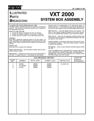 This document is an Illustrated Parts Breakdown (IPB) for the VXT 2000 System Box Assembly, designed to help users identify parts and their locations. It outlines how to use the IPB by referencing figures and their corresponding parts lists.