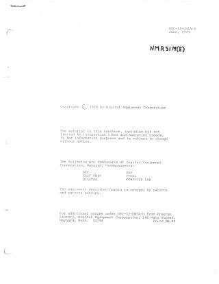 NMRSIM(E) is a program designed to calculate theoretical Nuclear Magnetic Resonance (NMR) spectra for compounds containing spin one-half nuclei like hydrogen, fluorine, and carbon-13. Users interactively input chemical shifts and coupling constants via a Teletype, with options for continuous adjustment of parameters and offsets to enhance resolution. The program displays calculated line spectra on a VR12 scope, complete with calibration points, and can output data to LINCtape, high or low-speed paper tape punch, and the Teletype. A key feature is the ability to merge multiple spectra, allowing for the simulation of complex spin systems or mixtures of compounds. The software requires a PDP-12A system equipped with a KW12A real-time clock, an MC12 4K Memory Extension, and the EAE option, and is loaded from a LAP6-DIAL tape.