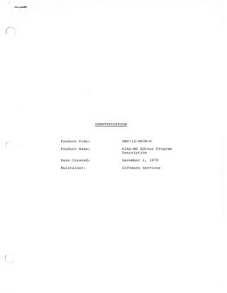 This document describes the DIAL-MS Editor, a comprehensive program designed for the PDP-12 computer that functions as an editor, filing system, and assembler. It is largely derived from the basic LINC program LAP6 by Mary Allen Wilkes and incorporates assembly portions from PDP-8 programs like PAL-D. The Digital Equipment Corporation acknowledges Mary Allen Wilkes for her contributions to LAP6.