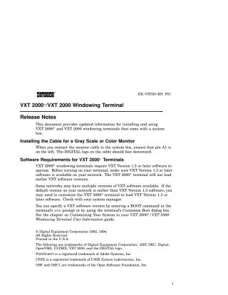This document provides release notes for the Digital VXT 2000+ and VXT 2000 Windowing Terminals, offering updated information for their installation and use. Key instructions include proper monitor cable connection, ensuring pin A1 is on the left and the DIGITAL logo faces downward. For software requirements, VXT 2000+ terminals necessitate VXT Version 1.3 or later software; older versions are incompatible. Users may need to customize their terminal's boot settings if their network's default VXT software is an earlier version.