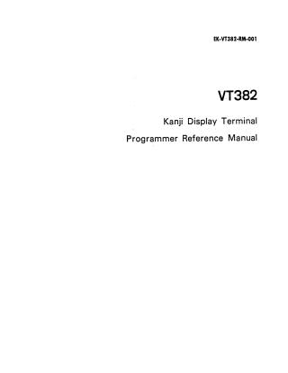 This document serves as a comprehensive Programmer Reference Manual for the VT382 Kanji Display Terminal, outlining the necessary information for programming its various functionalities. It details how to interact with the terminal's display, manage character sets, process user input, and control peripheral operations.