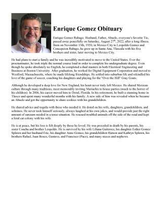 Enrique Gomez Rabago, known as a beloved husband, father, and "Abuelo," passed away peacefully on August 27th, 2022, after a long illness. Born on November 13th, 1950, in Mexico City, he grew up in Santa Ana, Tlaxcala, before moving to Mexico City. Driven to start a family and move to the U.S., he pursued a demanding academic path, earning dual master's degrees in Electrical Engineering and Business from Boston University despite not knowing English initially.