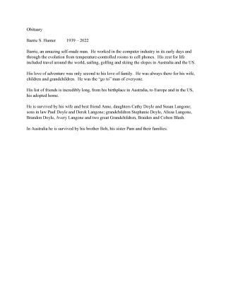 Barrie S. Hunter (1939-2022) was an accomplished, self-made man who began his career in the early computer industry and witnessed its evolution through to cell phones. He was known for his zest for life, which included world travel, sailing, golfing, and skiing in Australia and the US. His profound love for his family, including his wife, children, and grandchildren, was his top priority, and he was regarded as everyone's "go-to" person. He maintained a vast network of friends from his birthplace in Australia, to Europe, and his adopted home in the US. He is survived by his wife Anne, daughters Cathy Doyle and Susan Langone, sons-in-law Paul Doyle and Derek Langone, four grandchildren, two great-grandchildren, and in Australia, his brother Bob and sister Pam and their families.
