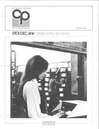 This document describes the Digital Equipment Corporation's RTOI DEC-link Data Entry Terminal, an economical, self-contained, and remotely locatable device for data entry. It offers Teletype and EIA serial line compatibility, featuring an integral 16-character keyboard for data input and "Nixie" tubes to display up to 12 digits of numeric data, along with four programmable status indicators.