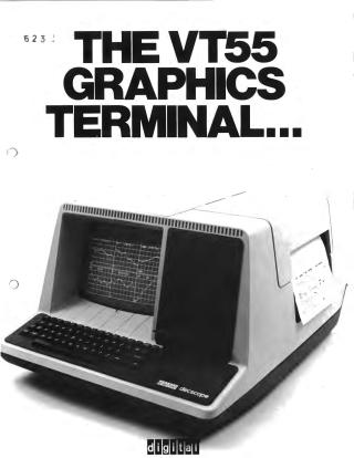 This document describes the Digital Equipment Corporation VT55 Graphics Terminal, an interactive CRT terminal designed for a wide range of applications requiring graphics. The VT55 offers waveform graphics capability, displaying two graphs of up to 512 data points each with a screen resolution of 512 x 236, along with text. It includes cursors for data editing and graph generation, and can simultaneously display any combination of text and graphics. A key feature is its integrated electrolytic copier, allowing users to obtain hard copies of the screen display (both characters and graphs) with a single key press.
