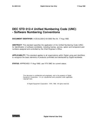 This document, DEC STD 012-4, "Unified Numbering Code (UNC) - Software Numbering Conventions," dated August 17, 1992, specifies the application of Digital Equipment Corporation's Unified Numbering Code (UNC) for identifying software worldwide.