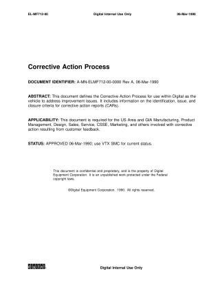 This document defines the Corrective Action Process (CAP) for use within Digital, specifically its US Area and GIA Manufacturing operations. The CAP serves as a vehicle to address improvement issues by providing a structured approach to identifying, issuing, and closing corrective action reports (CARs). The process is intended to drive continuous improvement across various departments including Manufacturing, Product Management, Design, Sales, Service, CSSE, and Marketing, especially those actions resulting from customer feedback. The document outlines responsibilities of involved personnel such as the Problem Identifier, CAR Issuer, Problem Solver, and Management, detailing their roles in the process. It also defines the types of corrective actions (remedial and systemic), the criteria for issuing a CAR, timing requirements for acknowledgment and response, and the sufficiency criteria for closure. The document includes information on escalation procedures, data base and information requirements for tracking and reporting CARs, and a standardized numbering scheme for CARs. Appendices provide details on corrective action reporting metrics and related documents.