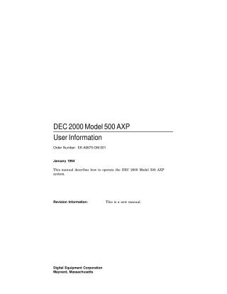 This manual serves as a user guide for operating the DEC 2000 Model 500 AXP system, a high-performance server based on the 64-bit Digital Alpha AXP RISC architecture, supporting operating systems like Windows NT, OpenVMS, and OSF/1.