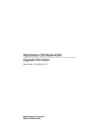 This document is an upgrade guide, published in May 1995, for customers and Digital service representatives, detailing how to transfer compatible hardware options from older Digital systems to a new AlphaStation 250 Model 4/266. It identifies specific internal/external disk drives (e.g., RZ25L, RZ28), CD-ROM/tape drives (e.g., TLZ06, RRD44), monitors, and expansion boxes that can be reused from existing systems such as DECstation, VAXstation 4000, DEC 3000 series, and DEC pc AXP 150.