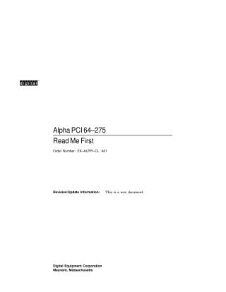 This document serves as a "Read Me First" guide for the Alpha PCI 64-275 motherboard, which features an Alpha 21064A microprocessor and flash ROM firmware. The firmware includes both a debug monitor and Windows NT ARC Firmware to assist with installation and system diagnostics.