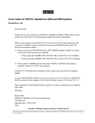 This cover letter from Digital Equipment Corporation informs customers purchasing DIGITAL AlphaServer 8200 or 8400 systems that their units may have a console firmware version different from the standard V5.1-30 pre-installed. This exception applies if the system includes an ML200 Prestoserve PCI NVRAM module (resulting in T5.1-18 for 625MHz CPUs or V5.0-102 for 440MHz CPUs) or if it's a 440MHz system with more than 10 CPUs (which will have V5.0-102). Customers are explicitly instructed not to install console V5.1-30 if any of these conditions apply. An accompanying "DIGITAL AlphaServer Firmware Update CD" is included, containing the necessary V5.0-102 and T5.1-18 console versions. These specific firmware restrictions are anticipated to be lifted with the release of console V5.2, expected in June 1998. The letter is from Roger Allen of DIGITAL AlphaServer Firmware Engineering.