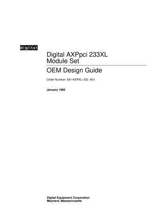 This OEM Design Guide provides system integrators with comprehensive details for integrating the Digital AXPpci 233XL Module Set into standard or custom applications. The module set, identical to that used in Digital's AlphaStation 400 Model 4/233, features a DECchip 21064A Alpha AXP™ 233 MHz RISC processor and supports DEC OSF/1 AXP and OpenVMS AXP operating systems.