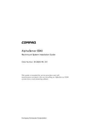 This document serves as an installation guide for service providers and self-maintenance customers, detailing the process of installing a Compaq AlphaServer ES40 system into a rack-mounting cabinet, specifically the AlphaServer M-Series cabinets (H9A10 Medium or H9A15 Tall).