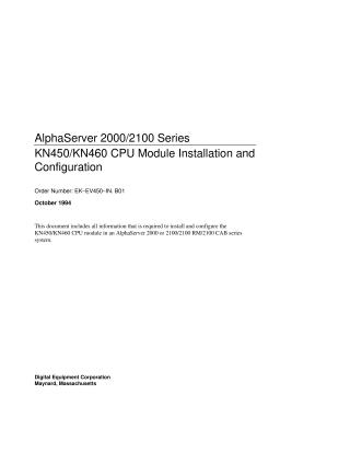 This document provides comprehensive instructions for installing and configuring KN450/KN460 CPU modules in AlphaServer 2000 and 2100 series systems, including RM and CAB models. Key steps include verifying the current CPU configuration for errors using console commands (show fru, show error), performing a full system power shutdown, and properly locating available CPU slots. The guide emphasizes that different CPU types (e.g., KN450 and KN460) cannot be mixed within the same system. It details various CPU configurations (1, 2, 3, or 4 CPUs) and includes a critical note for AlphaServer 2100 models, stating that CPU3 must occupy the MEM1 slot due to CPUs utilizing two memory slots. Proper airflow is essential, requiring all system bus slots to be populated with either a CPU module or a clear plastic module. The document also provides detailed CPU specifications (such as chip type, frequency, cache size, and power requirements) and environmental operating ranges, concluding with ordering information for the CPU modules, clear plastic modules, and related documentation.