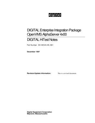 This document serves as a comprehensive guide for the DIGITAL Enterprise Integration Package OpenVMS AlphaServer 4x00 HiTest Suite. It provides detailed technical information regarding the interoperability test results, configuration, installation, setup, and operation of this suite, which is designed to function as a CI-Cluster Add-On within an existing OpenVMS cluster environment for medium- to high-end work groups.