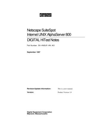 This document, published in September 1997 by Digital Equipment Corporation, provides an overview of the DIGITAL HiTest Suite for Netscape SuiteSpot Internet UNIX on the AlphaServer 800. It details the interoperability test results and serves as a guide for configuring systems for Internet Service Providers (ISPs) and Intranet users.
