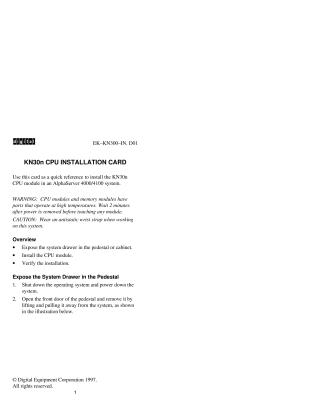 This document is a quick reference guide for installing the KN30n CPU module into an AlphaServer 4000 or 4100 system.