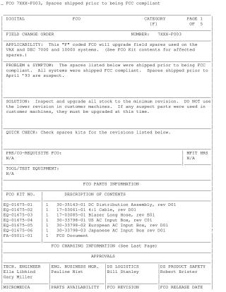 This Field Change Order (FCO 7XXX-F003) addresses the issue of non-FCC compliant spare parts for VAX and DEC 7000 and 10000 systems. Spares shipped before April 1993 were not FCC compliant, potentially leading to lower revision parts being used in customer machines, even though the original systems were compliant.