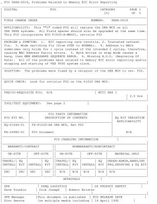 This Field Change Order (FCO 9XXX-0016) details the process for replacing the DBX MCU (Memory Control Unit) on all VAX 9XXX systems with revision F02. The FCO addresses six specific problems, all stemming from issues with memory ECC error reporting and/or the VAX 9000 system clock's stopping and starting. These issues include ECC reporting rate throttle, truncated refresh, mode switching errors, MAC Address Parity errors due to timing, system hangs in step mode, and missing Beginning Of Data (B.O.D.).