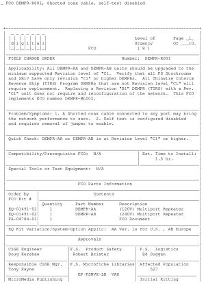 The FCO details a rework procedure, requiring the replacement of existing Revision "B1" DEMPRs (especially those from the Thinwire Interim Revenue Ship (TIRS) program) with Revision "C1" or higher units. The installation process involves verifying the new unit, carefully removing the old DEMPR and its connections, installing the new unit, reconnecting all cabling, running self-test diagnostics, and finally verifying proper network operation. It also emphasizes replacing the old installation guide (EK-DEMPR-IN) with the new one (EK-DEMPR-UG-001) which is compatible with "C1" and later revisions.