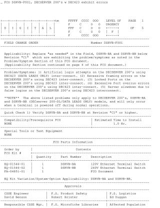 This Field Change Order (FCO DSRVB-F001) addresses critical operational issues with DECSERVER 200 models DSRVB-BA and DSRVB-BB, particularly those below Revision C1 utilizing DEC423 interconnects.