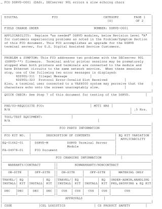 This Field Change Order (FCO DSRVD-0001) outlines an upgrade for the DECserver 90L (DSRVD) terminal server, targeting U.S. Digital Assisted Service Customers. The FCO addresses two critical problems with DSRVD firmware versions below Revision Level "A": the premature stopping of terminal and printer sessions (often accompanied by "%DS90L-311 Illegal Message" or "%DS90L-323 Protocol Error-Invalid Slot Received" errors) and unacceptably slow character echoing for terminal users connected to VAX4000 systems.