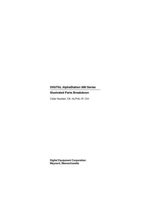 This document is an Illustrated Parts Breakdown (IPB) for the Digital Equipment Corporation AlphaStation 500 Series, including models such as the 500/266, 500/333, and 500/400. Its primary purpose is to enable users to identify specific parts and their locations within the hardware product. The document features detailed illustrations of various assemblies, particularly the kernel assemblies, with numeric callouts that correspond to items in a comprehensive parts list. The parts list provides descriptions, Digital/Vendor part numbers, revision levels, and usage codes. The illustrations demonstrate procedures for removing side panels, installing modules like risers, Media Adapter Units (MAU), sound modules, system modules, and memory modules (DIMMs), as well as connecting various cables (SCSI, power, audio) and identifying external ports. The document also indicates Field Replaceable Unit (FRU) level parts.