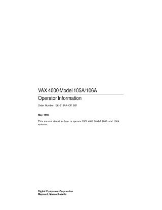 This manual provides comprehensive instructions for operating and maintaining VAX 4000 Model 105A and 106A systems. It covers the system hardware, including differences between the models, terminal settings, and system unit icons. A substantial part of the document is dedicated to the operation of internal system devices, such as TZ30, TZK10/TZK11 QIC, and TLZ06/TLZ07 cassette tape drives, RX23/RX26 diskette drives, and RRD42/RRD43 compact disc drives, detailing their controls, LED indicators, and procedures for inserting and removing media.