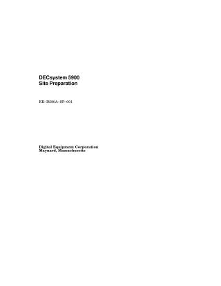 This document provides crucial information for preparing a computer room for the DECsystem 5900 server, intended to be used in conjunction with the Site Environmental Preparation Guide. It details the server's physical specifications, including its operational weight (440 kg/970 lb) and dimensions (170 cm H x 61 cm W x 86.4 cm D), alongside shipping weight (485 kg/1070 lb) and measurements.