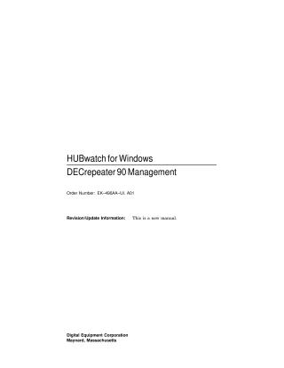 This document is a manual for system managers on how to use the HUBwatch for Windows application (Version 1.0) to manage DECrepeater 90 modules (specifically 90C and 90T) within IEEE 802.3 CSMA/CD networks. It provides detailed information on selecting a DECrepeater module and managing its configuration, performance, and faults.
