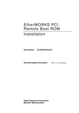 This document serves as an installation and configuration guide for the EtherWORKS PCI remote boot ROM (models DE45D-AR and DE45F-AR), intended for experienced network installers. The remote boot ROM allows computers equipped with an EtherWORKS Turbo PCI 10 adapter (DE450) to load their operating system, network drivers, and other files directly from a network file server, thus eliminating the need for local boot diskettes or hard drives.