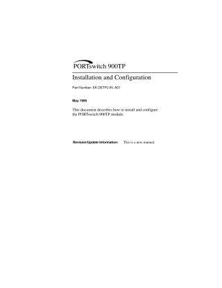 This document is an installation and configuration guide for the PORTswitch 900TP module. It provides step-by-step instructions for physically installing the module into a DEChub 900 or DEChub ONE, verifying initial operation via LEDs, and connecting cables. The guide details how to access the setup port to configure module parameters, including IP addresses, SNMP settings, BootP, and out-of-band management. It also covers firmware upgrades and the process for removing the module. Additional sections describe the module's features, components, redundant-link configurations for fault tolerance, troubleshooting using LED indicators, connector pin assignments, remote monitoring (RMON alarms and events), and comprehensive product specifications. The manual is intended for personnel responsible for installing and setting up the PORTswitch 900TP.