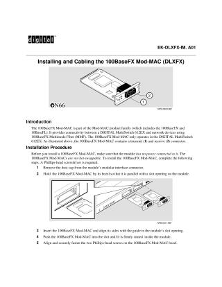 This document provides instructions for installing and cabling the 100BaseFX Mod-MAC module (DLXFX). The 100BaseFX Mod-MAC, part of the Mod-MAC product family, enables 100BaseFX Multimode Fiber (MMF) connectivity between a DIGITAL MultiSwitch 612EX and network devices, operating exclusively within the DIGITAL MultiSwitch 612EX. It features distinct transmit and receive connectors.