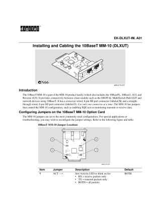 This document provides an introduction, configuration, and installation guide for the 10BaseT MM-10 (DLXUT) option card. The MM-10 is a component of the MM-10 product family, designed to provide 10BaseT connectivity between a host module (such as the DIGITAL MultiSwitch Hub 624T) and network devices. It features both crossover (labeled X) and straight-through (labeled //) 8-pin MJ port connectors, though only one can be used at a time.