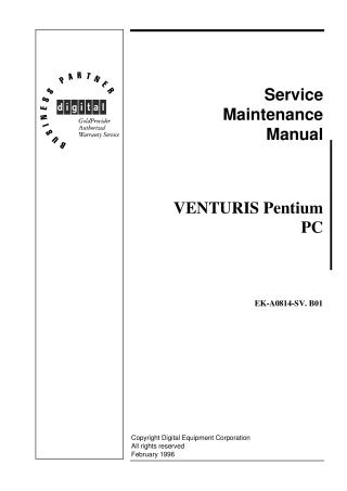 This Service Maintenance Manual, published in February 1996, is a comprehensive guide for A+ certified engineers servicing the Digital VENTURIS Pentium line of personal computers. It covers various VENTURIS Pentium models (including 560, 575, FP575, and 575 E) and their hardware features, such as microprocessor speeds (60-133 MHz), Plug and Play, Advanced Power Management, onboard video, and cache configurations.