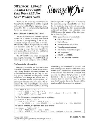This document provides product notes for the SWSD3-SC 1.05-GB Disk Drive SBB, manufactured by Digital Equipment Corporation and preformatted for Sun™ systems.