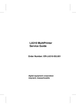 This document is the Service Guide for the LA310 MultiPrinter, published in October 1992 by Digital Equipment Corporation. It provides comprehensive information for servicing and maintaining the LA310, a low-cost, wide-carriage, 9-wire dot matrix printer designed for business applications.