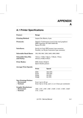 - Printer Specifications: The LA 310 is a 9-pin impact dot matrix printer supporting Digital's Conformance Level-2, IBM Proprinter III, and Epson FX-1050 protocols. It features serial (DECconnect) and parallel (Centronics) interfaces, selectable baud rates (150-9600), and various data/parity settings. Print speeds range from 300 CPS (HSD) to 55 CPS (NLQ modes). It supports a wide array of character sets (e.g., ASCII, ISO Latin, national sets) and print attributes (underline, italic, bold). Input buffer capacity is 16K or 32K characters.