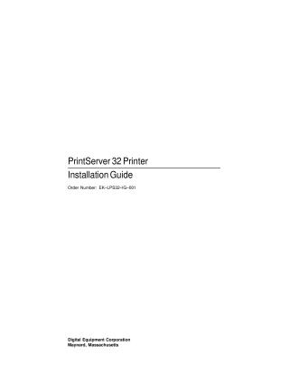 This document is an installation guide for the PrintServer 32 printer, published in July 1992 by Digital Equipment Corporation. It provides step-by-step instructions for the physical installation of the printer hardware, emphasizing that associated software must be installed before powering on the device.