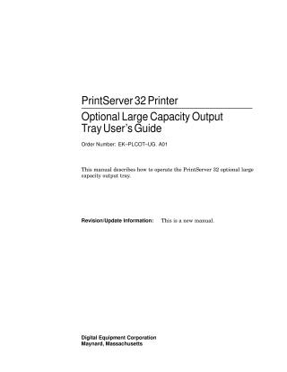 This manual serves as a user and system manager's guide for the PrintServer 32 Printer Optional Large Capacity Output Tray (OLCOT). It details the operation, setup, and troubleshooting of this accessory, which is designed to handle large print jobs up to 3,000 sheets.