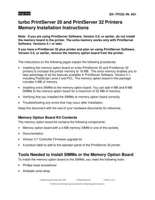 This document provides comprehensive instructions for installing memory in Digital's turbo PrintServer 20 and PrintServer 32 printers. The guide covers installing the memory option board, which comes with a 4MB SIMM, to increase printer memory to 16MB, and adding extra 4MB or 8MB SIMMs to expand total memory up to 32MB. This memory upgrade supports advanced features in PrintServer Software, Version 5.1 or later; users with Version 5.0 or earlier must not install or must remove the memory board.