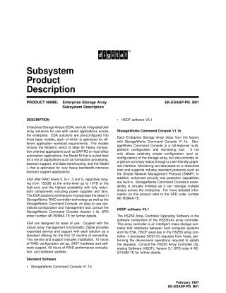 The ESA architecture integrates StorageWorks RAID controller technology and includes the StorageWorks Command Console V1.1b, a versatile multi-platform tool for array configuration, monitoring (supporting SNMP), and management. The HSZ50 Array Controller Operating Software (HSOF V5.1) handles SCSI I/O requests.