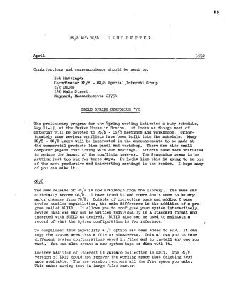 The April 1972 PS/8 AID OS/8 Newsletter provides updates on system developments and community activities. It announces the DECUS Spring Symposium '72, highlighting PS/8-OS/8 meetings and new product announcements, while noting scheduling conflicts.